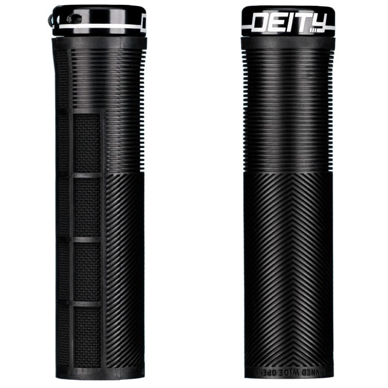La référence en matière de conception de poignées VTTComposé de caoutchouc DEITY TRC pour une durabilité exceptionnelleManchon intérieur conique pour assurer un contact parfait avec le guidonConception à pince unique avec boulons orientés vers l'avant dotés de loc-titeColliers de serrage en aluminium ano 6061 T6 noir gravé au laserConception à nervures courtes et larges pour plus de confort sans jeu latéralConception encastrée à moitié gaufrée pour un contrôle accru sans points chaudsConception de canal en V Chevron pour donner une sensation ergonomiqueTransition sans couture jusqu'à la fin de la prise pour plus de confortLongueur 132 mm avec diamètre extérieur 32 mmUtilisation prévue : Tous MTN / Enduro / DJ / Slopestyle et DH
